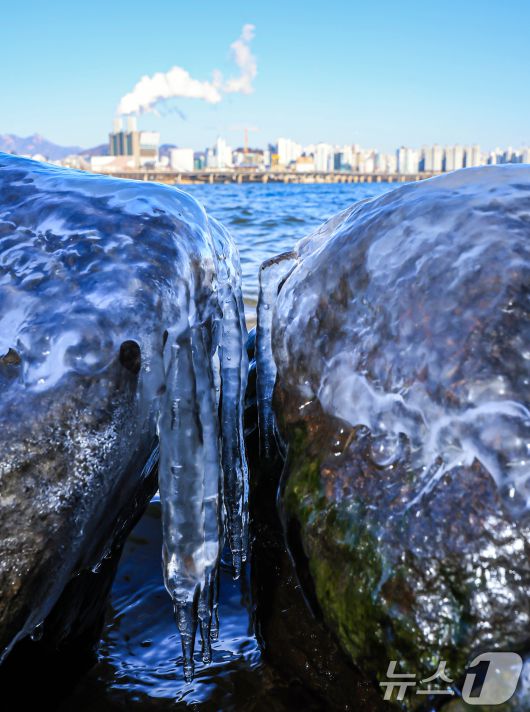 (서울=뉴스1) 김진환 기자 = 한낮에도 영하권 추위가 이어지는 26일 오후 서울 영등포구 여의도 인근 한강에 고드름이 얼어있다. 기상청은 주말인 27일 아침까지 영하 10도 안팎의 추위가 이어질 것으로 예보했다. 2025.12.26/뉴스1