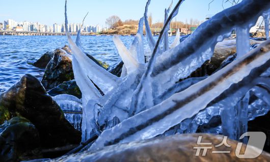 (서울=뉴스1) 김진환 기자 = 한낮에도 영하권 추위가 이어지는 26일 오후 서울 영등포구 여의도 인근 한강에 고드름이 얼어있다. 기상청은 주말인 27일 아침까지 영하 10도 안팎의 추위가 이어질 것으로 예보했다. 2025.12.26/뉴스1