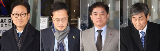 국회 '패스트트랙 충돌' 사건에 연루된 더불어민주당 박범계(왼쪽부터)·박주민 의원과 김병욱 대통령실 정무비서관, 이종걸 전 의원이 지난 19일 서울 양천구 서울남부지법에서 열린 1심 선고 공판을 마치고 법원을 나서고 있다./연합뉴스 |