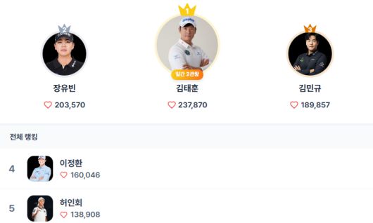 장유빈은 20만3570표로 2위를 차지했다. 공격적인 플레이와 성장 가능성을 동시에 보여주며 KPGA 팬들의 관심을 받아온 장유빈은 최근 대회에서도 인상적인 모습을 남기며 지지 기반을 넓혀가고 있다.