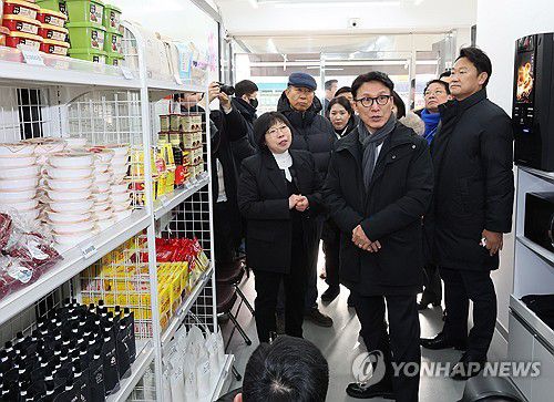 (서울=연합뉴스) 이정훈 기자 = 김민석 국무총리가 26일 서울 종로구 창신동 쪽방상담소 온기창고를 찾아 진열된 물품들을 살펴보고 있다.