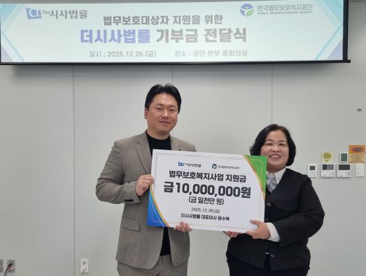 26일 한국법무보호복지공단에서 열린 전달식에는 더시사법률 윤수복 대표와 공단 이현미 이사장 직무대리 등 양 기관 관계자들이 참석했다.