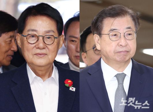 2020년 서해에서 발생한 공무원 피격 사건을 은폐하려 한 혐의로 재판에 넘겨진 문재인 정부 안보 라인인 박지원 전 국가정보원장(왼쪽), 서훈 전 국가안보실장. 류영주 기자 |