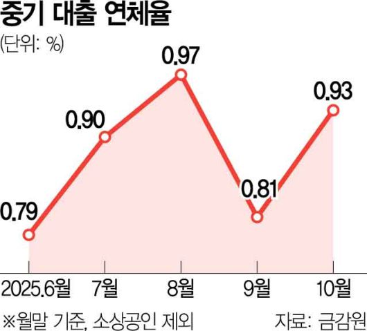 연체 증가는 중소기업에서 많았다. 10월 말 기준 중기(소상공인·자영업자 제외) 연체율은 전월 대비 0.12%포인트나 상승해 0.93%까지 올랐다. 올 5월(1.03%) 이후 가장 높다. 대기업 대출 연체율은 0.14%로 같은 기간 0.02%포인트 올랐다.