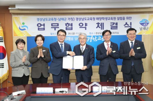 (남해=국제뉴스) 구정욱 기자 = 남해군과 경남교육청은 26일 도교육청에서 경남교육청 학생교육원 남해분원을 증·개축해 '(가칭)경상남도교육청 해양학생교육원' 설립하기 위한 업무협약을 체결했다.