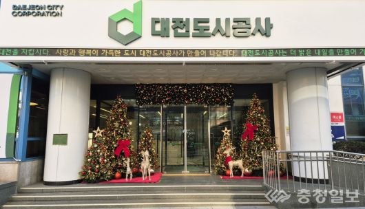대전도시공사 본사 정문 앞에 설치된 성탄 트리가 겨울 저녁 원도심의 분위기를 밝히고 있다. 과하지 않은 장식과 은은한 조명이 어우러지며, 시민들이 잠시 머물러 사진을 남길 수 있는 열린 공간으로 활용되고 있다 |