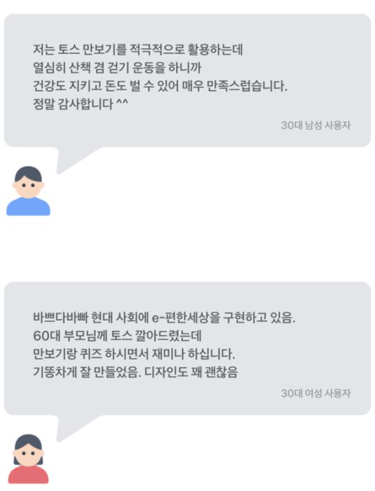 토스는 오프라인과 연동해 지도상에 표시된 특정 지점에 도착하면 추가 포인트를 주는 방식으로 이용자들의 활동을 유도한다. 또 친구와 합산 걸음 수를 달성하면 보상을 주는 '소셜' 기능을 통해 사용자를 앱으로 계속 불러들이고 있다. 토스 앱 내에서 즉시 현금처럼 송금하거나 결제에 사용할 수 있다는 점도 장점이다.