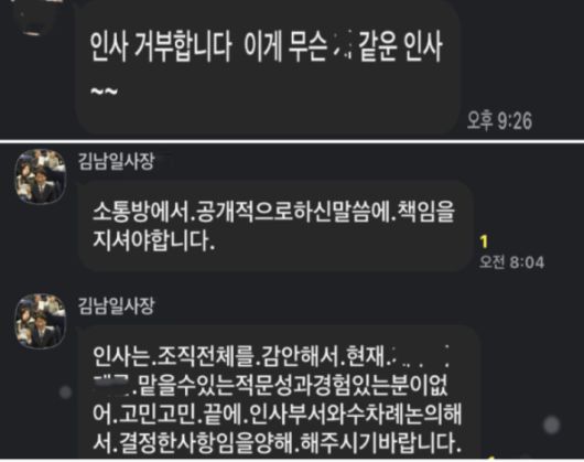 한 팀장급 간부가 "인사를 거부합니다. 이게 무슨 X같은 인사"라고 공개적으로 비판한 것이다.