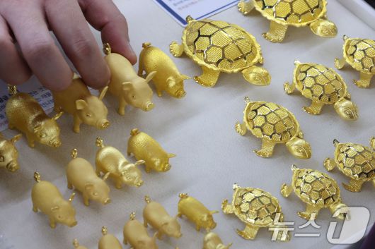 (서울=뉴스1) 이광호 기자 = 순금 한 돈(3.75g) 가격이 100만 원 시대를 눈앞에 두고 있는 26일 서울 종로구 한국금거래소 종로본점에서 직원이 금제품을 정리하고 있다. 이날 한국금거래소에 따르면 순금(24K) 가격은 1돈(3.75g)당 90만8000원(-0.55%)으로 전 거래일 보다 5000원 내렸다. 매입가는 76만8000원(-1.04%)으로 전 거래일 보다 8000원 하락했다. 2025.12.26/뉴스1