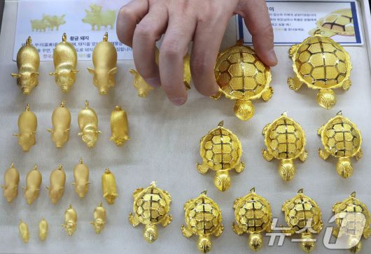 (서울=뉴스1) 이광호 기자 = 순금 한 돈(3.75g) 가격이 100만 원 시대를 눈앞에 두고 있는 26일 서울 종로구 한국금거래소 종로본점에서 직원이 금제품을 정리하고 있다. 이날 한국금거래소에 따르면 순금(24K) 가격은 1돈(3.75g)당 90만8000원(-0.55%)으로 전 거래일 보다 5000원 내렸다. 매입가는 76만8000원(-1.04%)으로 전 거래일 보다 8000원 하락했다. 2025.12.26/뉴스1