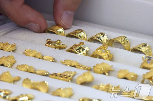 (서울=뉴스1) 이광호 기자 = 순금 한 돈(3.75g) 가격이 100만 원 시대를 눈앞에 두고 있는 26일 서울 종로구 한국금거래소 종로본점에서 직원이 금제품을 정리하고 있다. 이날 한국금거래소에 따르면 순금(24K) 가격은 1돈(3.75g)당 90만8000원(-0.55%)으로 전 거래일 보다 5000원 내렸다. 매입가는 76만8000원(-1.04%)으로 전 거래일 보다 8000원 하락했다. 2025.12.26/뉴스1
