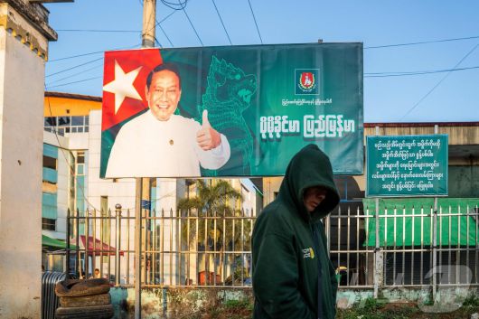 20일, 미얀마 북부 샨주 라시오에서 한 남성이 군부의 대리정당 통합연대발전당(USDP) 의장 킨 이의 사진이 걸린 선거 운동 광고판 앞을 지나가고 있다. ⓒ AFP=뉴스1 |