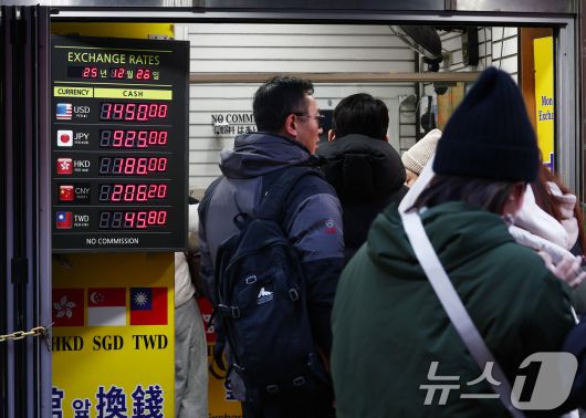 (서울=뉴스1) 김민지 기자 = 원·달러 환율이 크게 하락한 26일 서울 시내 환전소에서 외국인 관광객들이 환전을 하고 있다. 이날 원·달러 환율은 외환 당국 개입에 연말 증시 강세까지 더해지며 1430원까지 급락하는 등 하루 새 30원 넘게 하락 했다. 2025.12.26/뉴스1