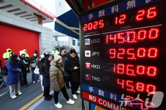 (서울=뉴스1) 김민지 기자 = 원·달러 환율이 크게 하락한 26일 서울 시내 환전소에서 외국인 관광객들이 환전을 하고 있다. 이날 원·달러 환율은 외환 당국 개입에 연말 증시 강세까지 더해지며 1430원까지 급락하는 등 하루 새 30원 넘게 하락 했다. 2025.12.26/뉴스1