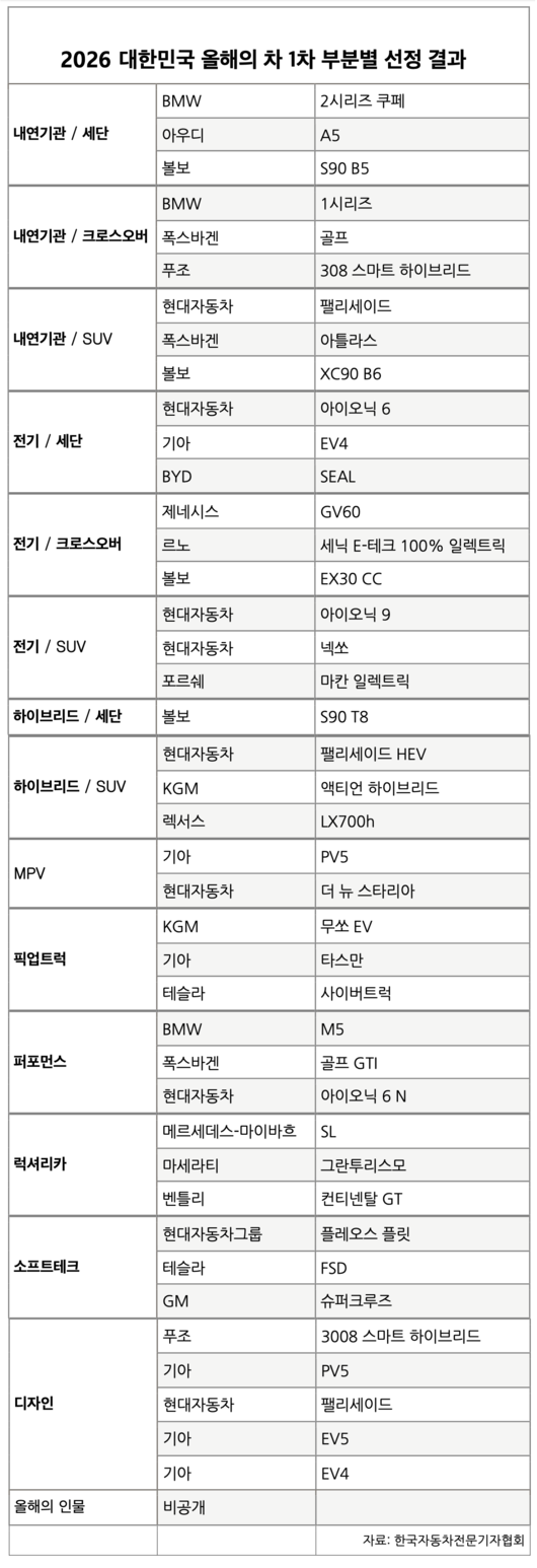 2026 대한민국 올해의 차는 대상인 ‘2026 대한민국 올해의 차’를 비롯해 △올해의 내연기관 세단 △올해의 내연기관 크로스오버 △올해의 내연기관 SUV △올해의 전기 세단 △올해의 전기 크로스오버 △올해의 전기 SUV △올해의 하이브리드 세단 △올해의 하이브리드 SUV △올해의 MPV △올해의 픽업트럭 △올해의 퍼포먼스 △올해의 럭셔리카 △올해의 소프트테크 △올해의 디자인 △올해의 인물 등 총 15개 부문에서 시상한다.