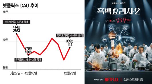 26일 앱 통계 분석 플랫폼 아이지에이웍스의 '모바일인덱스'에 따르면, 흑백요리사2의 1~3화가 공개된 이달 16일 넷플릭스의 국내 DAU(일간활성이용자수)는 376만1666명(안드로이드·iOS 합산)을 기록했다. 이는 직전 주 같은 요일 대비 약 7.6% 증가한 수치로 콘텐츠 공개 직후 사용자 반응이 즉시 나타났음을 보여준다.