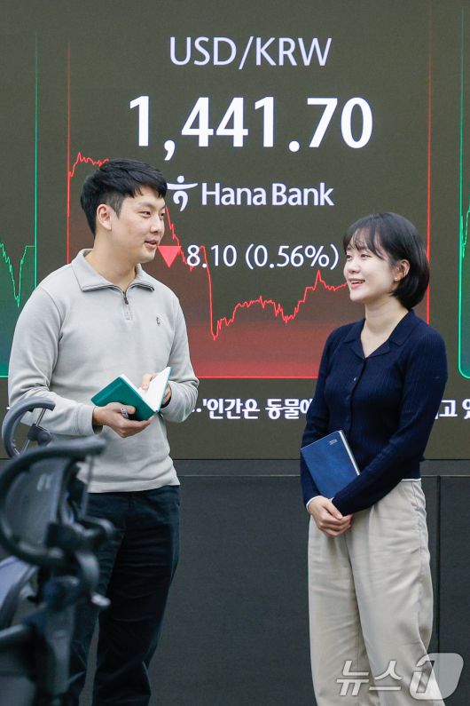 (서울=뉴스1) 안은나 기자 = 26일 오후 서울 중구 하나은행 딜링룸 전광판에 원·달러 환율이 나오고 있다. 이날 코스피는 전일 종가와 비교해 21.06포인트(p)(0.51%) 상승한 4129.68로 거래를 마쳤다. 코스닥은 전일 대비 4.47포인트(p)(0.49%) 상승한 919.67로 마감했다. 서울외환시장에서 달러·원 환율은 전일 오후 3시 30분 주간종가 대비 9.5원 내린 1440.3원을 기록했다. 2025.12.26/뉴스1