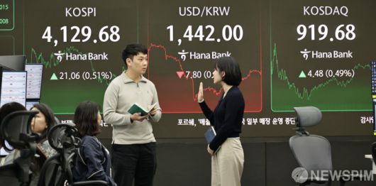 [서울=뉴스핌] 양윤모 기자 = 정부의 연이은 외환시장 안정 대책속 26일 오후 코스피가 전장 종가보다 21.06 포인트(0.51%) 상승하며 4129.68로, 코스닥은 4.47 포인트(0.49%) 상승한 919.67로 한 주간의 장을 마감한 가운데, 서울 중구 하나은행 딜링룸에서 직원들이 업무를 보고 있다. 서울외환시장에서 달러/원 환율은 전장 대비 7.80원 하락한 1442.00원에 주간거래를 마감했다. 2025.12.26 yym58@newspim.com
