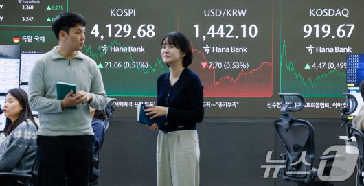 (서울=뉴스1) 안은나 기자 = 26일 오후 서울 중구 하나은행 딜링룸 전광판에 코스피, 코스닥 종가와 원·달러 환율이 나오고 있다. 이날 코스피는 전일 종가와 비교해 21.06포인트(p)(0.51%) 상승한 4129.68로 거래를 마쳤다. 코스닥은 전일 대비 4.47포인트(p)(0.49%) 상승한 919.67로 마감했다. 서울외환시장에서 달러·원 환율은 전일 오후 3시 30분 주간종가 대비 9.5원 내린 1440.3원을 기록했다. 2025.12.26/뉴스1