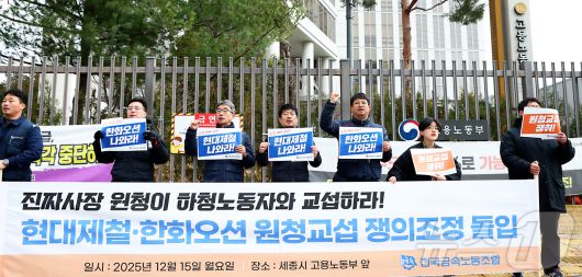 전국금속노동조합 현대제철·한화오션 비정규직지회와 거제통영고성조선하청지회 조합원들이 15일 오전 세종시 고용노동부 앞에서 쟁의조정 돌입 기자회견을 열고, 현대제철과 한화오션 원청의 즉각적인 교섭으로 노동자의 처우 개선을 요구하며 중앙노동위에 쟁의조정 신청서를 제출했다. 2025.12.15/뉴스1 ⓒ News1 김기남 기자 |