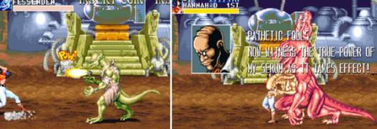 근육질의 주인공 남자 2명이 몬스터들을 해치우다가 흰색 늑대의 영혼을 먹고 괴물로 변신하여 도륙하는 내용이죠. 여기에는 주인공이 변신할 때 까지 간을 보는 대머리 마도사가 등장하는데, 이 대머리 마도사가 바로 보스로 변신하면서 주인공을 습격합니다.