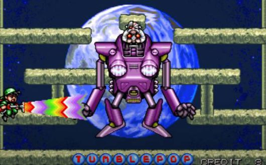 개인적으로 좋아하는 '텀블팝'에서도 닥터 에그맨 같이 메카닉을 탄 라스트 보스가 등장하죠. 대머리 박사가 기계를 타고 주인공을 습격하는 것을 알 수 있습니다. 폭탄도 떨구고 미니 로봇들도 소환해서 꽤 난도도 있고 짜증나는 보스죠.