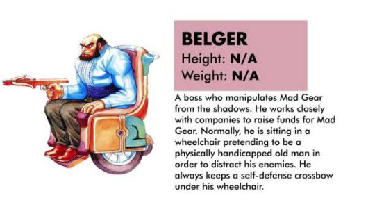 검떠: 최후의 스테이지에 등장하는 이 벨거는 범죄 조직 매드 기어의 우두머리로, 휠체어에 앉아 하거의 딸 제시카를 붙잡은 체 주인공을 기다리죠.