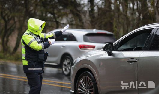 [제주=뉴시스] 우장호 기자 = 제주 산간에 대설특보가 내려진 3일 오전 제주시 1100도로 초입부인 어승생 삼거리에서 제주서부경찰서 소속 경찰관들이 교통 통제를 하고 있다. 2025.12.03. woo1223@newsis.com |