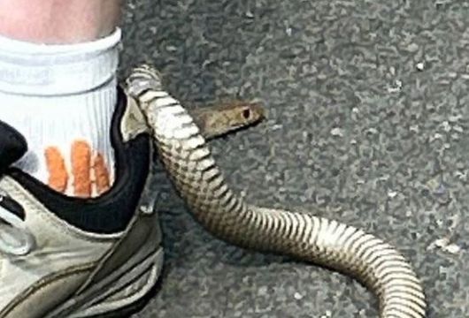 처음에는 나뭇잎이 스친 것으로 생각했지만 곧 독사인 것이 확인했다. 뱀은 여성의 운동화 뒤쪽에 달린 천 고리 안으로 미끄러져 들어가서 다리에 밀착된 채 움직이지 못하는 상태였다.
