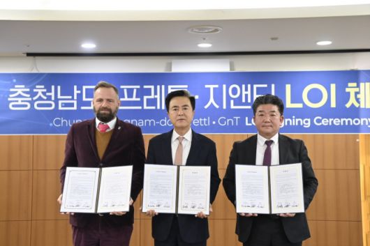 김태흠 충남지사는 26일 도청에서 손일수 지앤티 대표, 빌리 프란츠 독일 프레틀그룹 최고경영자(CEO)와 투자 협력 의향서를 체결했다. 지역 스타트업인 지앤티는 도의 지원을 받아 프레틀그룹과 4600억원 규모의 수출 계약을 맺었다.