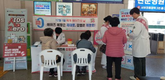 경남 합천군 관계자들이 지난 9일 '에이즈 예방주간'을 맞아 서부정류장역에서 인식개선 캠페인을 실시하고 있다. /합천군 |