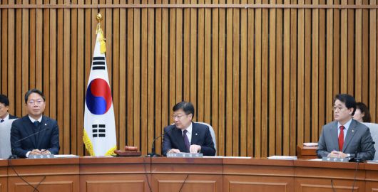 지난 22일 국회에서 열린 김호철 감사원장 임명동의에 관한 인사청문특별위원회 전체회의에서 위원장으로 선임된 정점식 국민의힘 의원이 회의를 진행하고 있다. 왼쪽은 간사인 김승원 더불어민주당 의원, 오른쪽은 간사인 배준영 국민의힘 의원. 연합뉴스 |