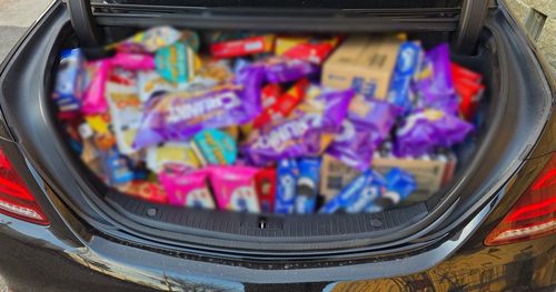 트렁크에 실린 과자와 음료 |