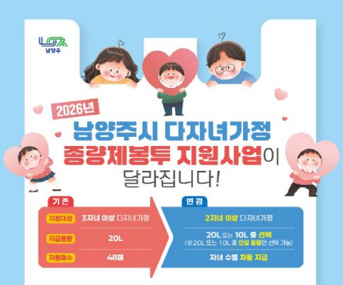26일 남양주시에 따르면 '다자녀가정 종량제봉투 지원사업'은 다자녀가정의 경제적 부담을 줄이기 위해 추진 중인 사업으로, 기존에는 3자녀 이상 가정만 지원 대상에 포함돼 있었다.