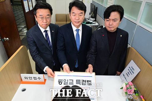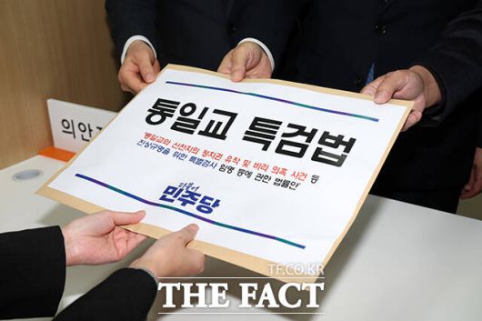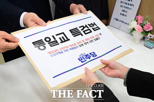 [더팩트ㅣ국회=남윤호 기자] 더불어민주당 이용우 원내부대표, 문진석 원내운영수석부대표, 김현정 원내대변인(왼쪽부터)이 26일 오후 서울 여의도 국회 의안과에 '통일교 특검법'을 제출하고 있다.
