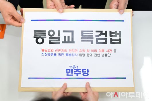 아시아투데이 송의주 기자 = 더불어민주당 문진석 원내운영수석부대표와 이용우 원내부대표, 김현정 원내대변인이 26일 국회 의안과에서 통일교 특검법안을 제출하고 있다. ⓒ "젊은 파워, 모바일 넘버원 아시아투데이"
