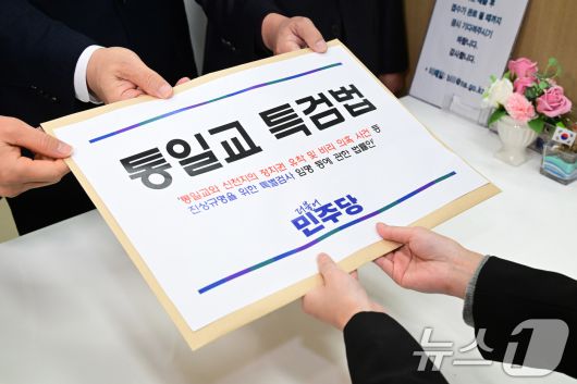 (서울=뉴스1) 신웅수 기자 = 문진석 더불어민주당 원내수석이 26일 서울 여의도 국회 의안과에 통일교 특검법안을 제출하고 있다. (공동취재) 2025.12.26/뉴스1