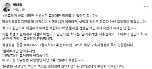 임 교육감은 “기존 학생 지원체계로 해결이 어렵다고 판단되면, 학교는 ‘알려주기만’ 해달라”라며 “그 이후의 판단·조치·외부 연계·관리는 교육청이 전담하겠다”라고 적었다.