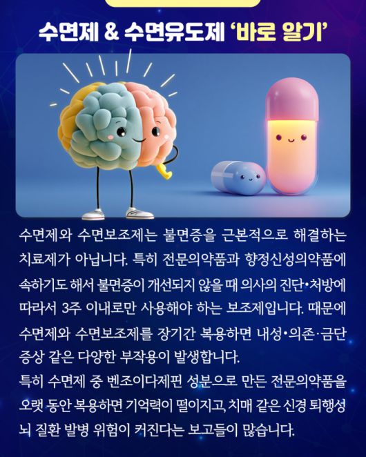 특히 수면제 중 벤조이다제핀 성분으로 만든 전문의약품을 오랫 동안 복용하면 기억력이 떨이지고, 치매 같은 신경 퇴행성 뇌 질환 발병 위험이 커진다는 보고들이 많습니다.