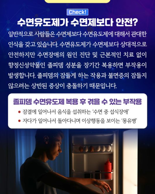 일반적으로 사람들은 수면제보다 수면유도제에 대해서 관대한 인식을 갖고 있습니다. 수면유도제가 수면제보다 상대적으로 안전하지만 수면장애의 원인 진단 및 근본적인 치료 없이 향정신성약물인 졸피뎀 성분을 장기간 복용하면 부작용이 발생합니다. 졸피뎀의 잠들게 하는 작용과 불면증의 잠들지 않으려는 상반된 증상이 충돌하기 때문입니다.