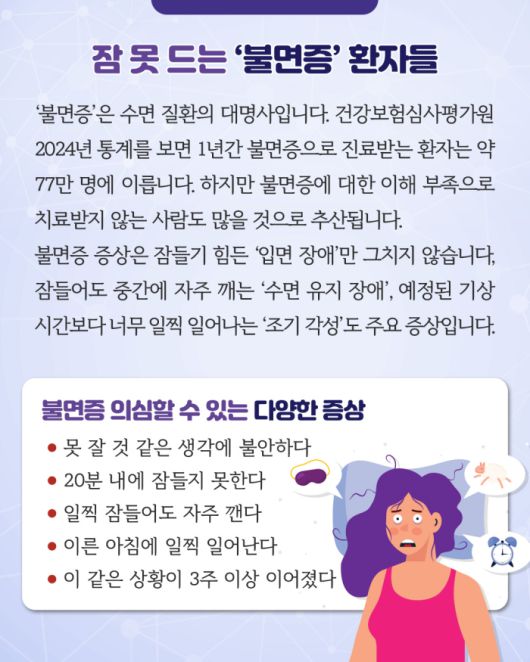 '불면증’은 수면 질환의 대명사입니다. 건강보험심사평가원 2024년 통계를 보면 1년간 불면증으로 진료받는 환자는 약 77만 명에 이릅니다. 하지만 불면증에 대한 이해 부족으로 치료받지 않는 사람도 많을 것으로 추산됩니다.