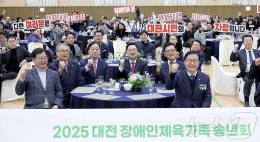 (대전=뉴스1) 이동원 기자 = 조원휘 대전시의회 의장은 26일 유성구 덕명동 장애인체육센터에서 열린 ‘2025년 대전장애인체육가족 송년회’에 참석해 수상자들을 축하하고, 장애인체육 저변 확대를 위한 정책적 관심과 지원을 약속했다. 이날 행사는 지역을 대표하는 단체·기관장, 수상자와 가족, 체육단체 관계자 등 250여 명이 참석한 가운데 장애인체육회 결산보고를 시작으로 유공자 시상, 주요내빈 축사, 다과 순으로 진행됐다. (대전시의회 제공. 재판매 및 DB금지) 2025.12.26/뉴스1