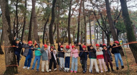 밀양다봄센터 이용 어린이들이 삼문솔숲에서 숲놀이(밧줄체험)을 하고 있다. /밀양돌봄센터 |