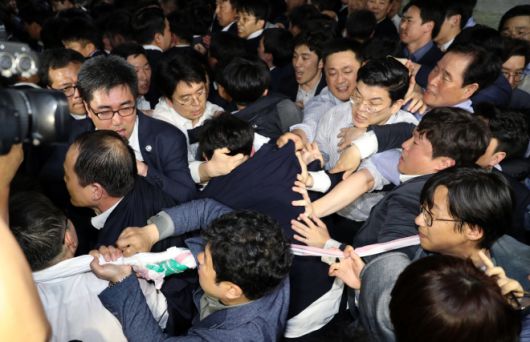 2019년 4월 공수처법 등을 패스트트랙 안건으로 처리하는 것을 막기 위해 국회에서 여야 의원들이 충돌하는 모습. 국회의장의 경호권 발동으로 국회 방호원들이 의원들을 끌어내려고 시도하고 있다. 2019.4.25 뉴스1 |
