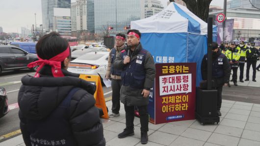 IBK기업은행 노동조합이 금융위원회 앞에서 천막농성을 벌이며 총액인건비제 문제 해결을 촉구하고 있습니다. 이재명 대통령이 직접 “해결책을 검토하라”고 지시했지만, 관계 당국의 후속 움직임은 아직 보이지 않고 있습니다. 노조는 다음 달 총파업까지 예고했습니다. 이연아 기자입니다.