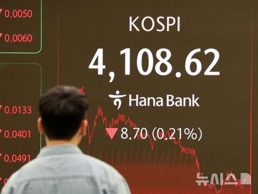 [서울=뉴시스] 배훈식 기자 = 24일 오후 서울 중구 하나은행 딜링룸 전광판에 코스피가 전 거래일 보다 8.70 포인트(0.21%) 내린 4108.62 포인트를 나타내고 있다. 2025.12.24. dahora83@newsis.com |