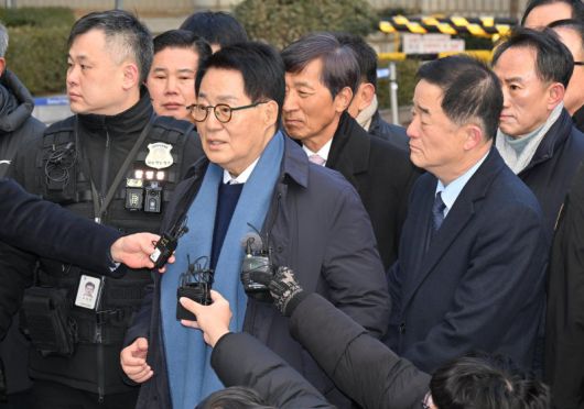 '서해 공무원 피격 사건'을 자진 월북으로 몰아가려 했다는 혐의로 재판에 넘겨진 박지원 전 국정원장이 12월 26일 서울 서초구 중앙지방법원에서 열린 1심 선고 공판에 출석하면서 취재진 질문에 답하고 있다. 뉴스1 |