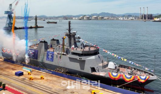 지난 6월 HD현대중공업 울산 본사에서 2400톤급 필리핀 원해경비함 ‘라자 술라이만함’의 진수식이 열리고 있다. (사진=HD현대중공업) |