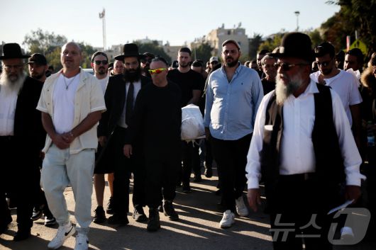 (아슈도드 로이터=뉴스1) 이정환 기자 = 25일(현지시간) 이스라엘 아슈도드에서 열린 장례식에서 조문객들이 호주로 이주한 뒤 시드니 본다이 비치에서 열린 하누카행사 중 총격으로 사망한 27세 프랑스 국적 유대인 남성 댄 엘카얌의 시신을 운구하고 있다. 2025.12.25. ⓒ 로이터=뉴스1