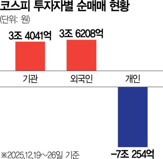 개인투자자들이 국내 증시에서 차익 실현에 나선 사이 기관과 외국인 투자가들이 동시에 대규모 자금을 투입하며 연말 산타 랠리를 주도하고 있다. 지수 조정 국면에서 개인의 매도 물량을 외국인과 기관이 흡수하는 구도가 이어지며 시장 관심도 다시 반도체 대형주로 쏠리는 모습이다.
